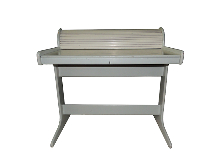 Mesa de escritorio gris con persiana