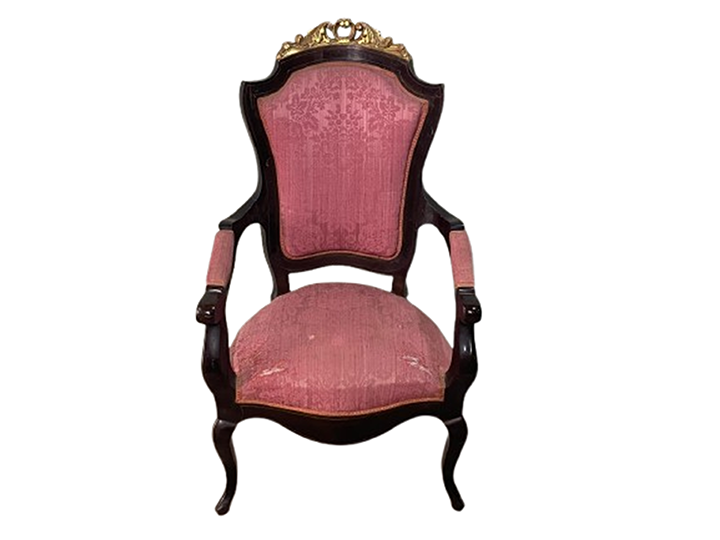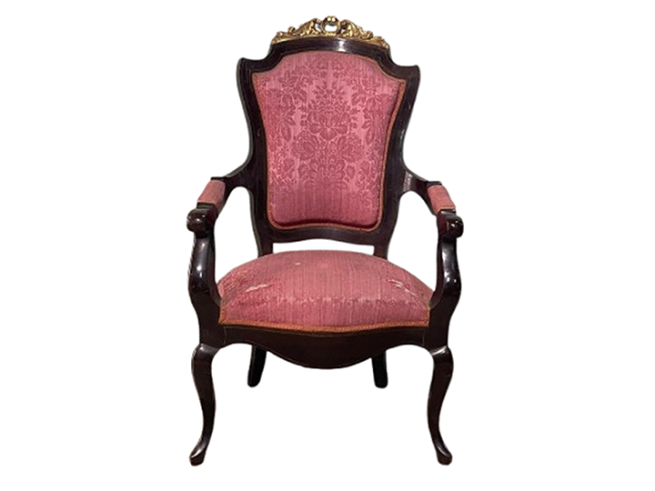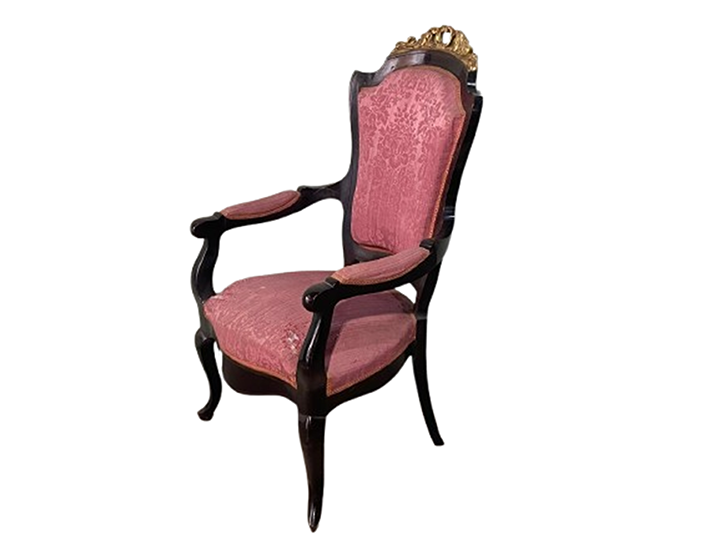 Sillón isabelino caoba y oro tapizado damasco rosa (conjunto sillería: S77, 2 sillones SI-77 y 6 sillas SIL-77)