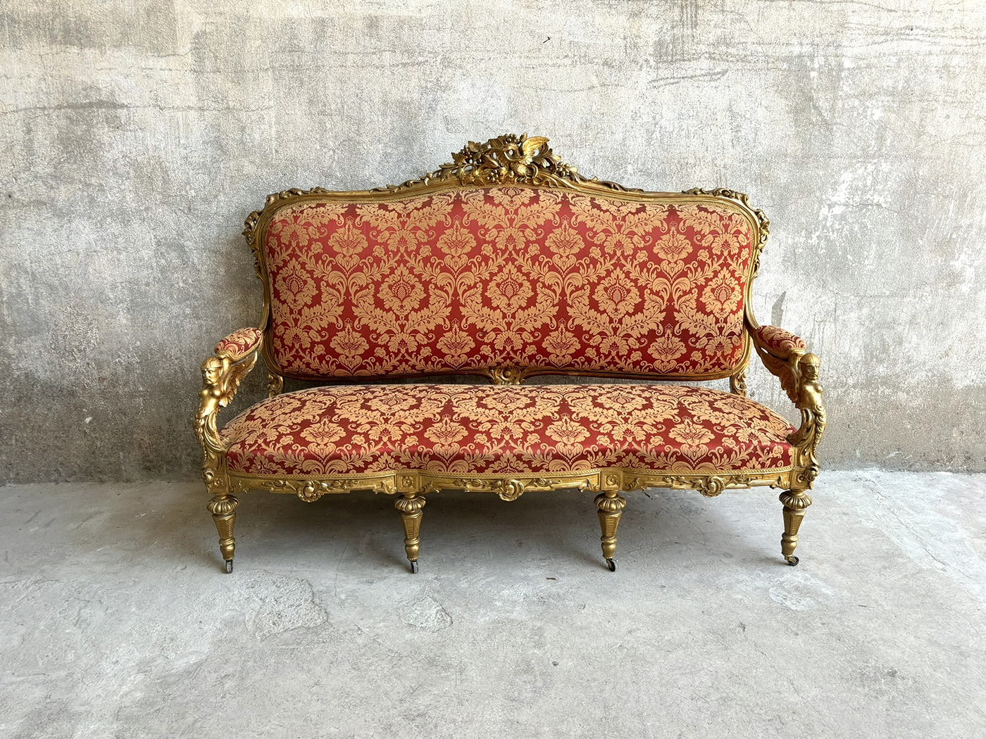 Sofá alfonsino dorado tallado tapizado damasco (Hay 2) y (Juego sillería con 6 sillones a juego SI14)