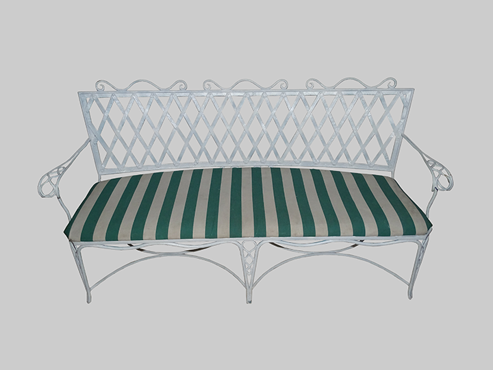 Sofá hierro forja respaldo rombos cojín tapizado flores