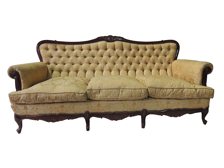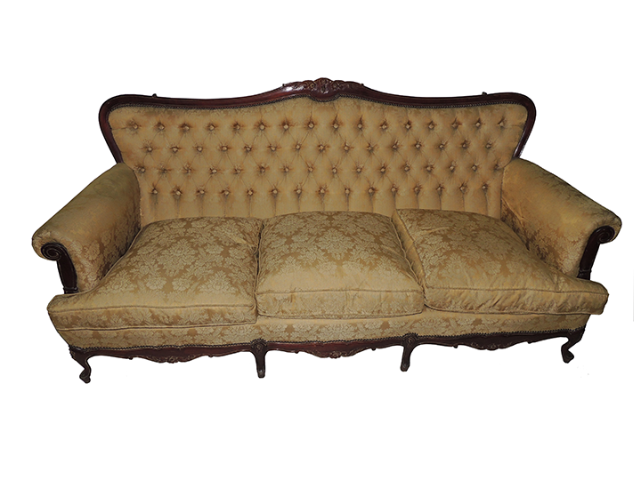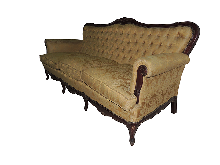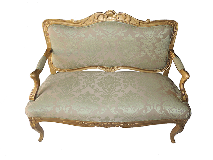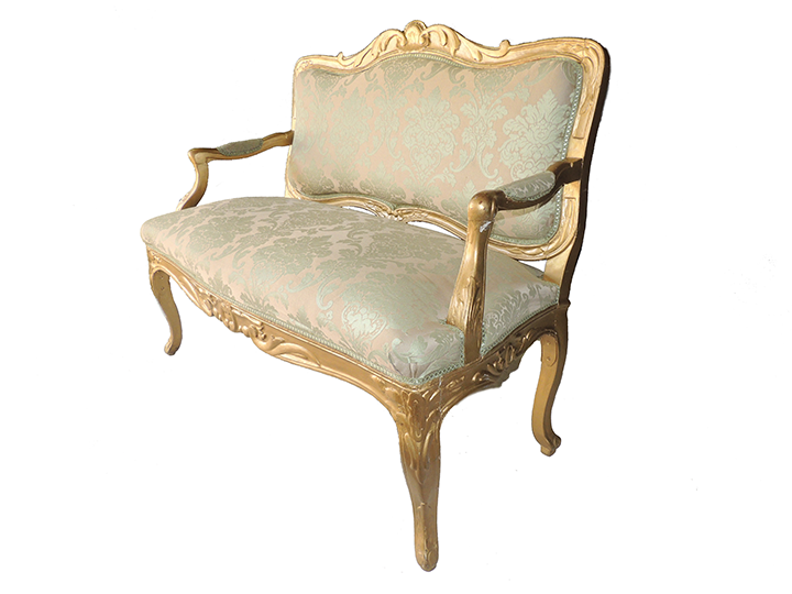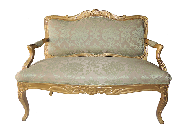 Sofá Luis XV dorado tapizado damasco verde (juego sillería: sofá S59, 3 sillones SI91 y 2 sillas SIL100)